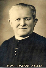 3 dicembre 1943: una spedizione punitiva fa irruzione nella sua canonica, dove era stata offerta ospitalità a 15 ebrei, in maggioranza donne e bambini che si apprestavano a varcare il confine. Erano accompagnati da don Gian Maria Rotondi, collaboratore del card. Boetto. Sono le 17,00: un colpo di pistola infrange i vetri dell’antico oratorio di S. Liberata, dove i fuggiaschi erano stati rifocillati prima di intraprendere il lungo viaggio tra i boschi verso il confine. Con i due sacerdoti ci sono anche l’ing. Mario Bongrani e il ragionier Pio Alessandrini, futuro senatore della Repubblica. Una pallottola sfiora l’anziana domestica che s’accascia priva di sensi. Le squadracce irrompono nella casa e mettono tutto a soqquadro. Fortunatamente non frugano in un cassetto dove sono custodite le schede che attestano gli altri passaggi. Approfittando della confusione, Alessandrini e Bongrani riescono a dileguarsi, ma per don Folli inizia il suo martirio. Legato all’inferriata del cortiletto, viene percosso a sangue perché riveli i nomi dei collaboratori: un ciuffo di capelli gli viene strappato, ma don Folli non parla e non parlerà neppure in seguito. Frattanto all’esterno sono raggruppati gli Ebrei, che, mani sulla nuca, sono costretti a marciare sotto la pioggia. I bambini, strattonati, piangono, uno sviene: nessuno conoscerà mai la sua sorte né quella degli altri. In paese vengono arrestati alcuni collaboratori di don Piero, quasi tutti «spalloni» e perciò grandi conoscitori dei luoghi di confine. Gente semplice, abituata ad ogni rischio. Don Folli non li considera dei disonesti ma, in quell’autunno del 1943, preziosissimi collaboratori per salvare vite umane.